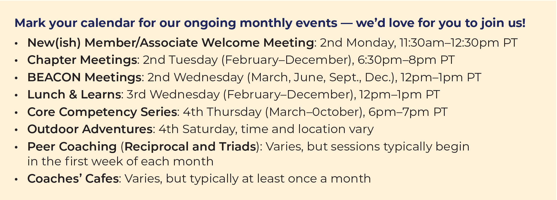 We’re also pleased to offer virtual and in-person connection and networking events with our New(ish) Member Welcome, a Coaches' Cafe, and an Outdoor Adventure. You will find all program and event details below. All of these offerings are designed to support you as a coach — whether you’re deepening your craft, growing your business, or simply looking for meaningful conversation with peers who understand this work. Coaching isn’t meant to be practiced alone — come join us!