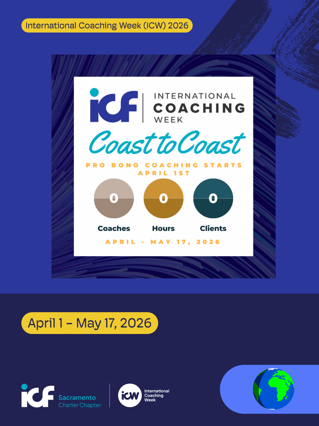 In partnership with ICF Los Angeles and ICF Maryland, ICF Sacramento invites coaches to offer at least 3 hours of pro bono coaching between April 1 and May 17. The coaching can be individual, team, group, mentor coaching, or coaching supervision. Submit your hours by May 22 to receive a certificate for coaching.